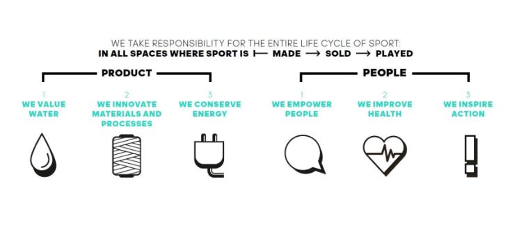 Su mapa de sostenibilidad identifica seis prioridades estratégicas para abordar los problemas y desafíos de los espacios donde se fabrica el deporte (todos los lugares donde se crean diseñan, fabrican y envían), vendidos (minoristas, mayoristas y de comercio electrónico) y reproducidos (desde el patio interior al campo al aire libre en todo el mundo). Estas seis prioridades estratégicas son las mostradas en el esquema anterior y son: